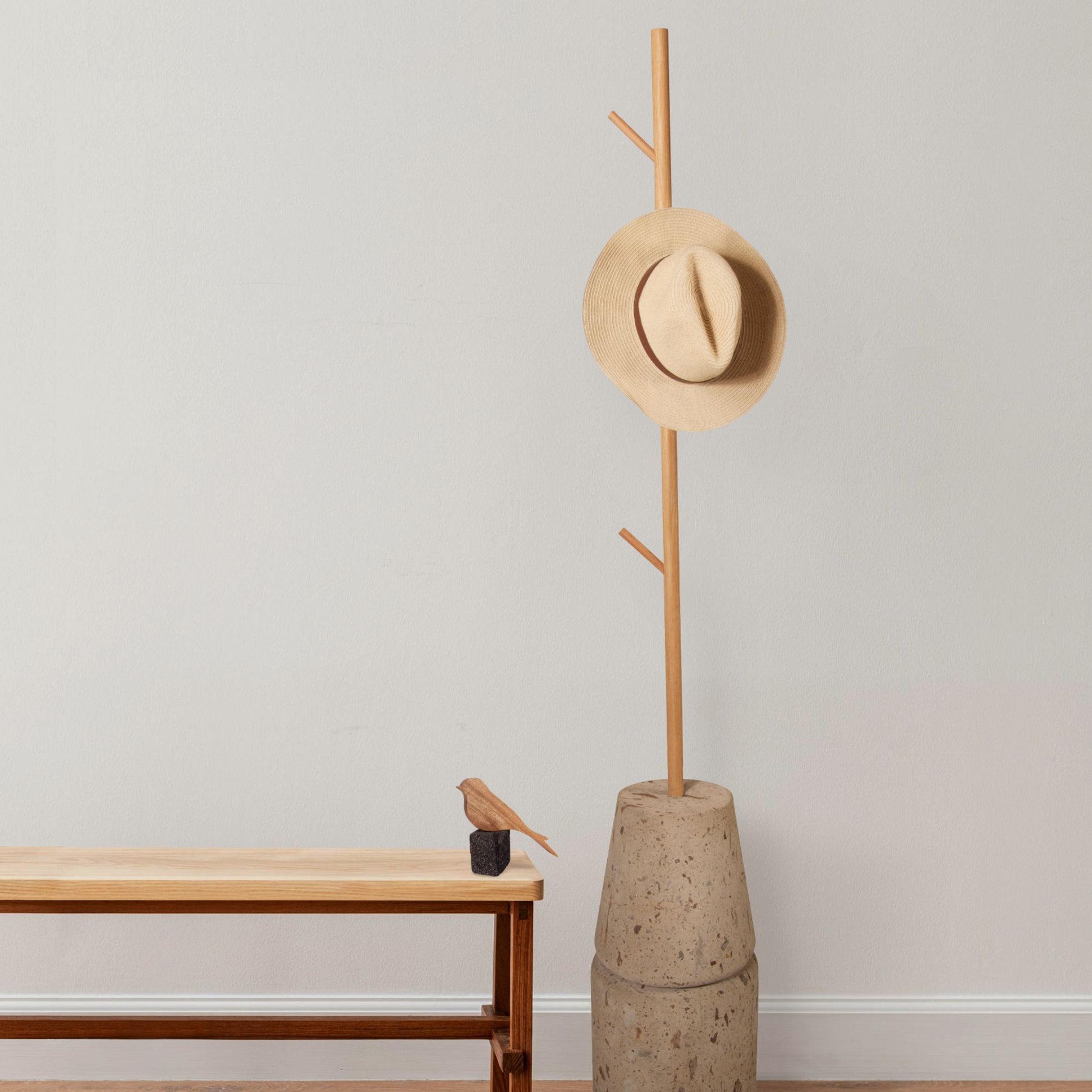 Ave golondrina fabricada en madera y montada en una pieza de piedra