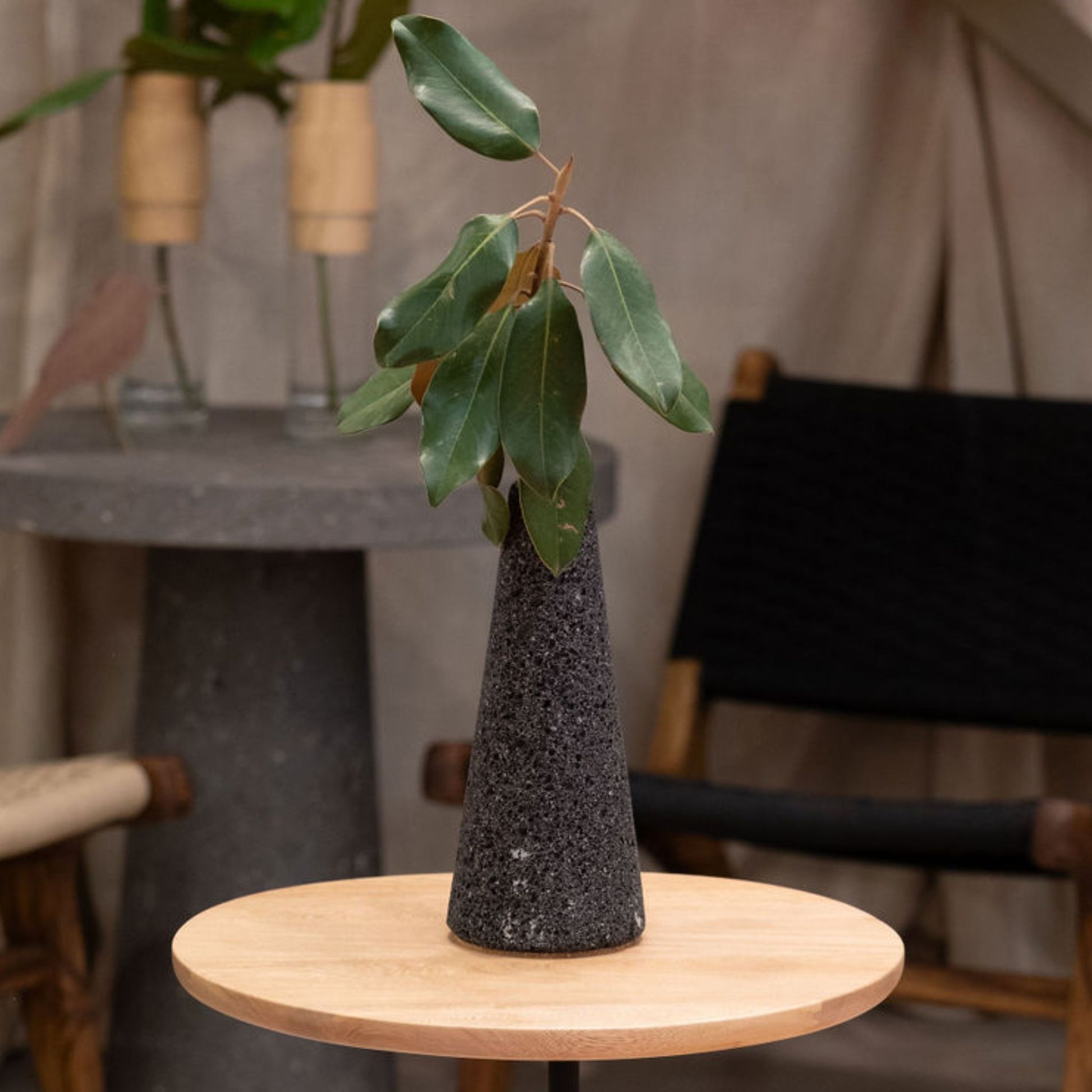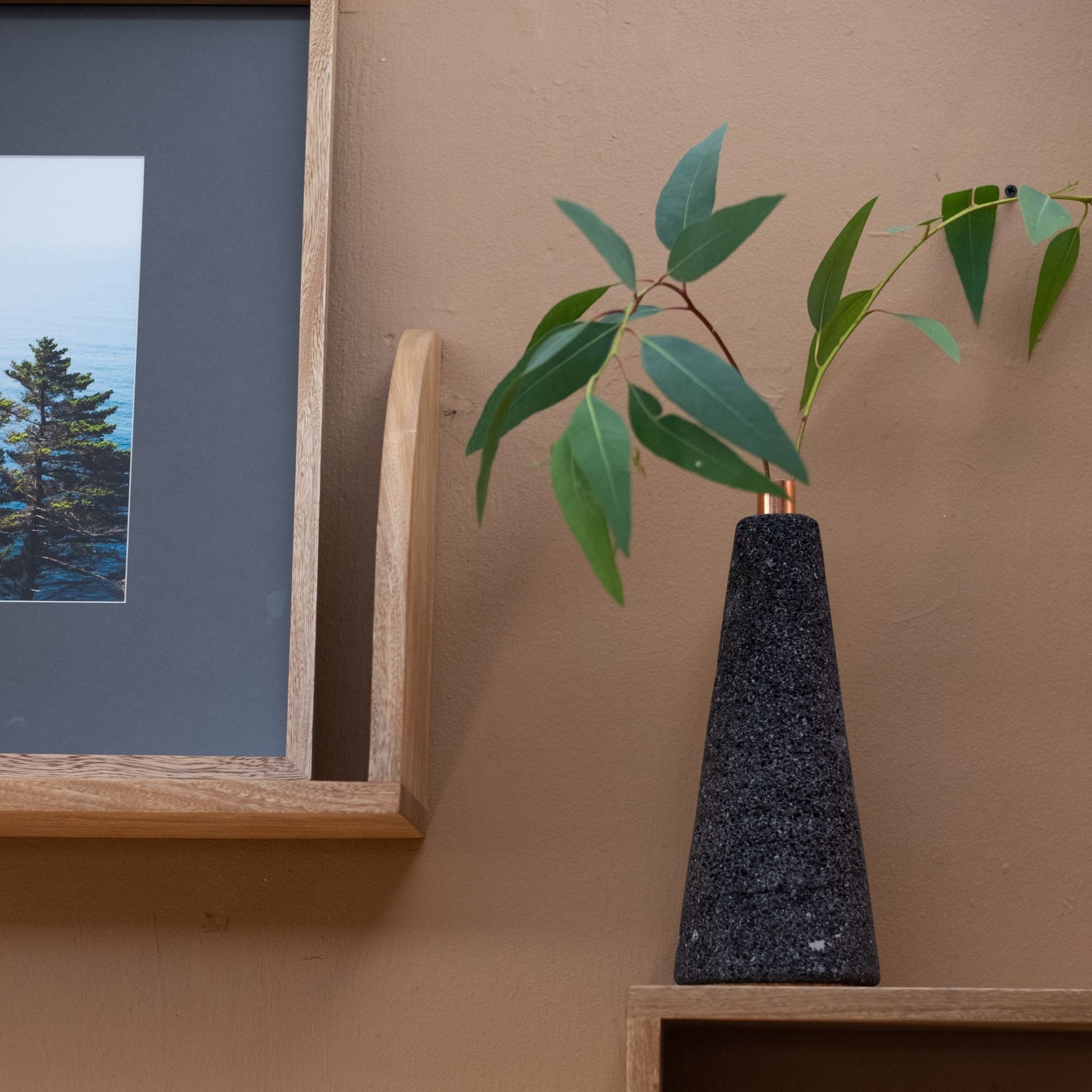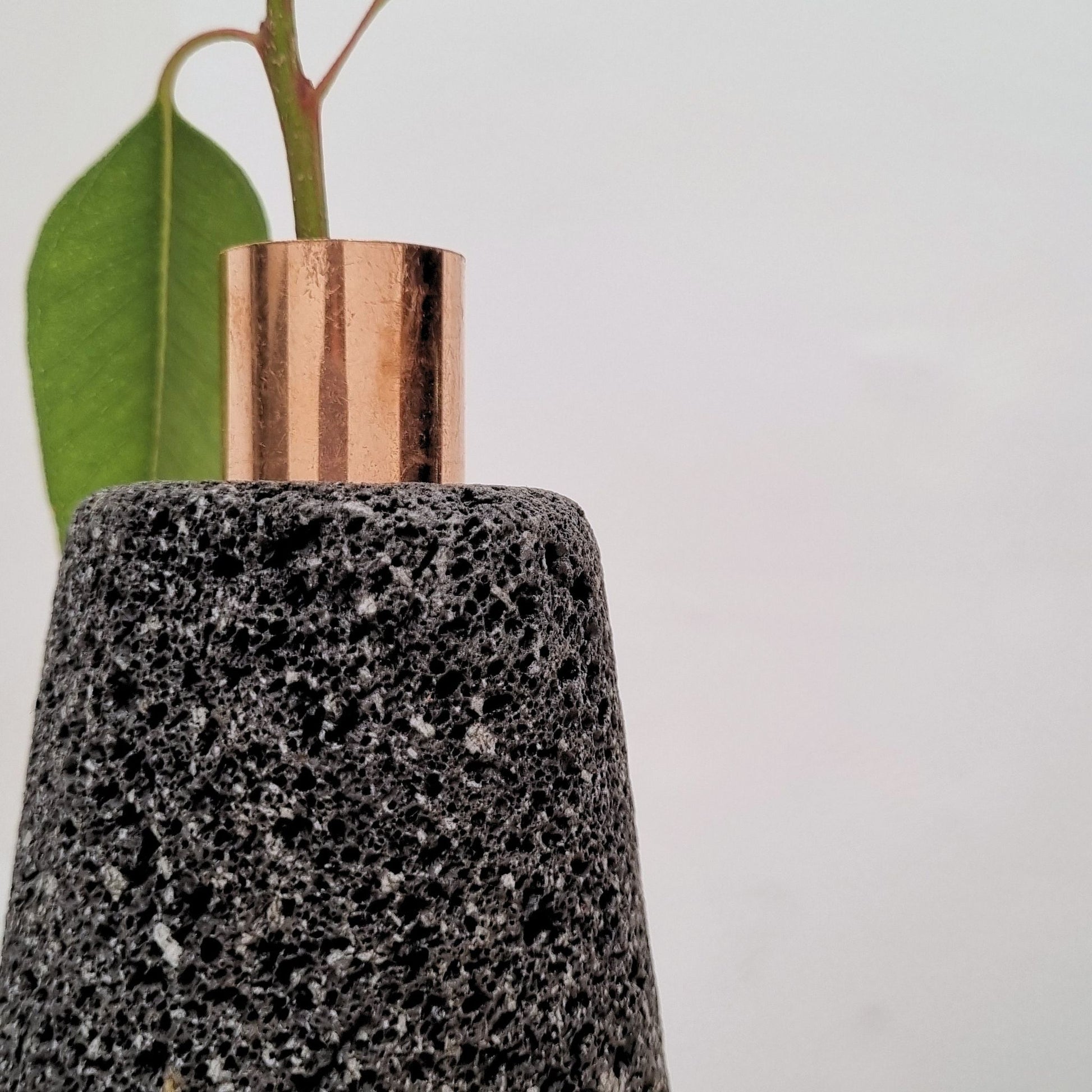 Floero cónico de piedra volcánica con detalle de cobre