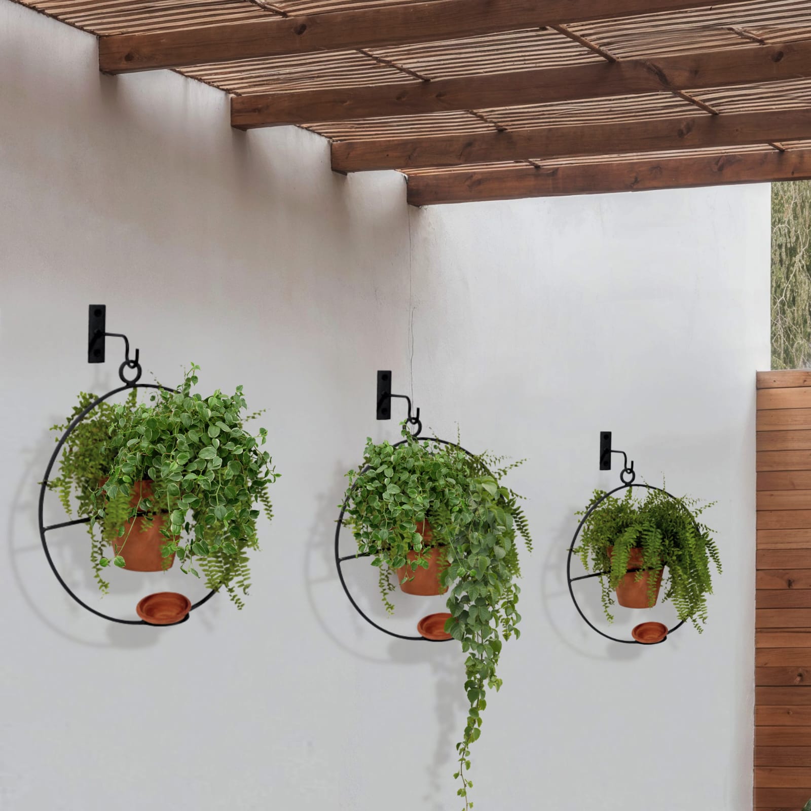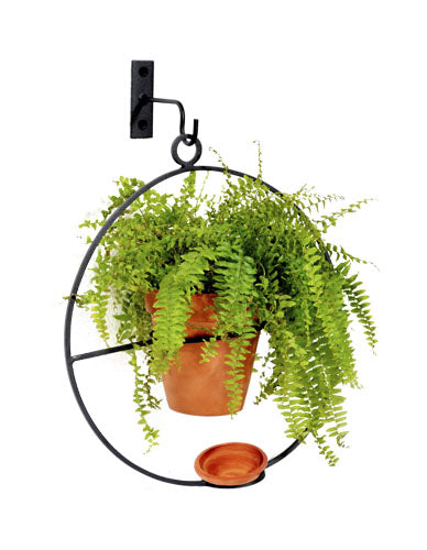 Macetero de herrería color negro en forma circular con espacio para colocar una maceta de 6". Pueden colgarse del techo ó del muro mediante un gancho (incluido).